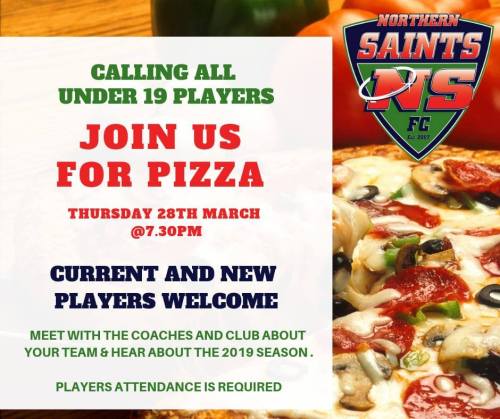 Calling all Under 19 Northern Saints players to come down to Mutton Reserve this Thursday night for free pizzas ansd to talk about the upcoming season with the coaching panel and committee.